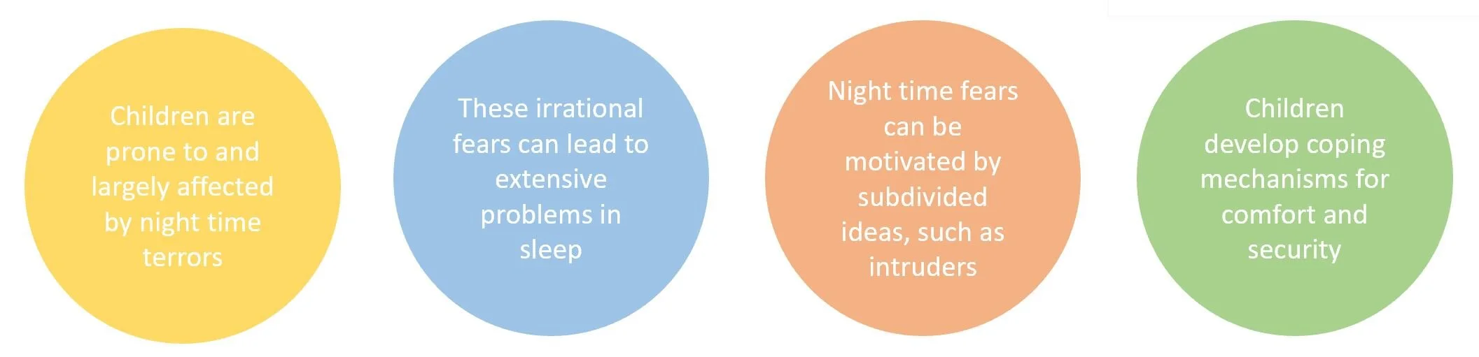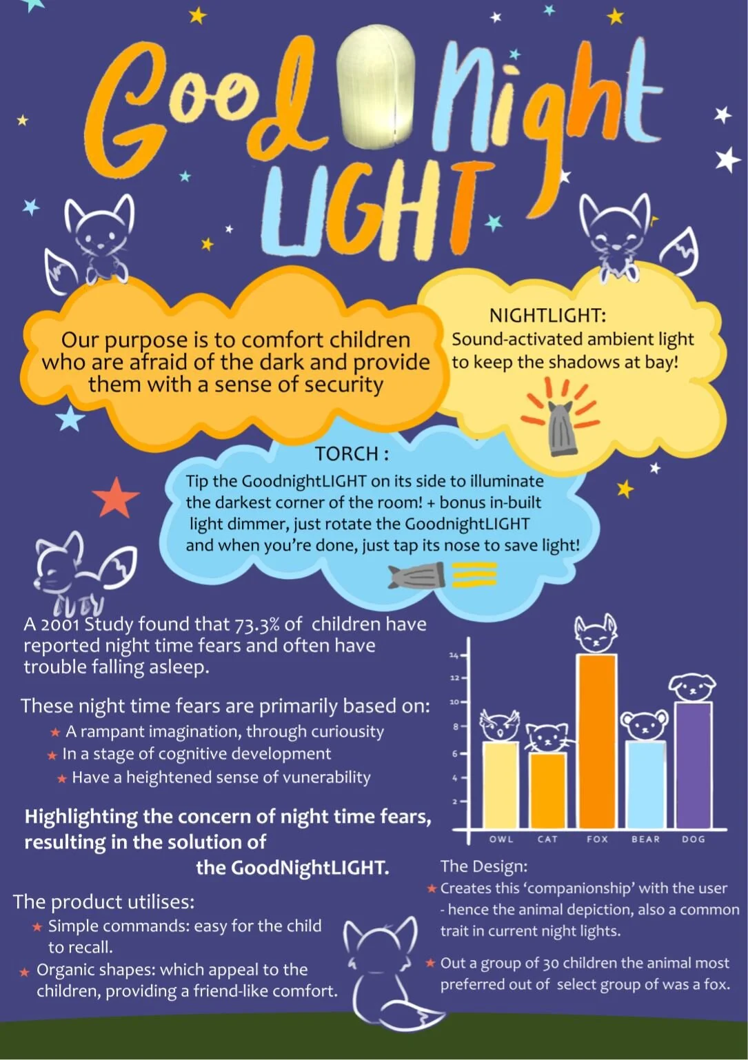 Our problem area works in relation to children who have developed a fear of the dark. Research done suggested that approximately 25% of children experienced problems in some aspect of sleep, and a large contribution to these statistics derived from night terrors. It was also found that 70% of children reported night time fears, which can progress into resistance to sleep, difficulty initiating sleep and increased nightmares. These statistics ultimately suggest a necessary focus to be placed on the topic of night time fears and concerns for children. Thus, our design solution aims to comfort children and provide them with a sense of security during the night.