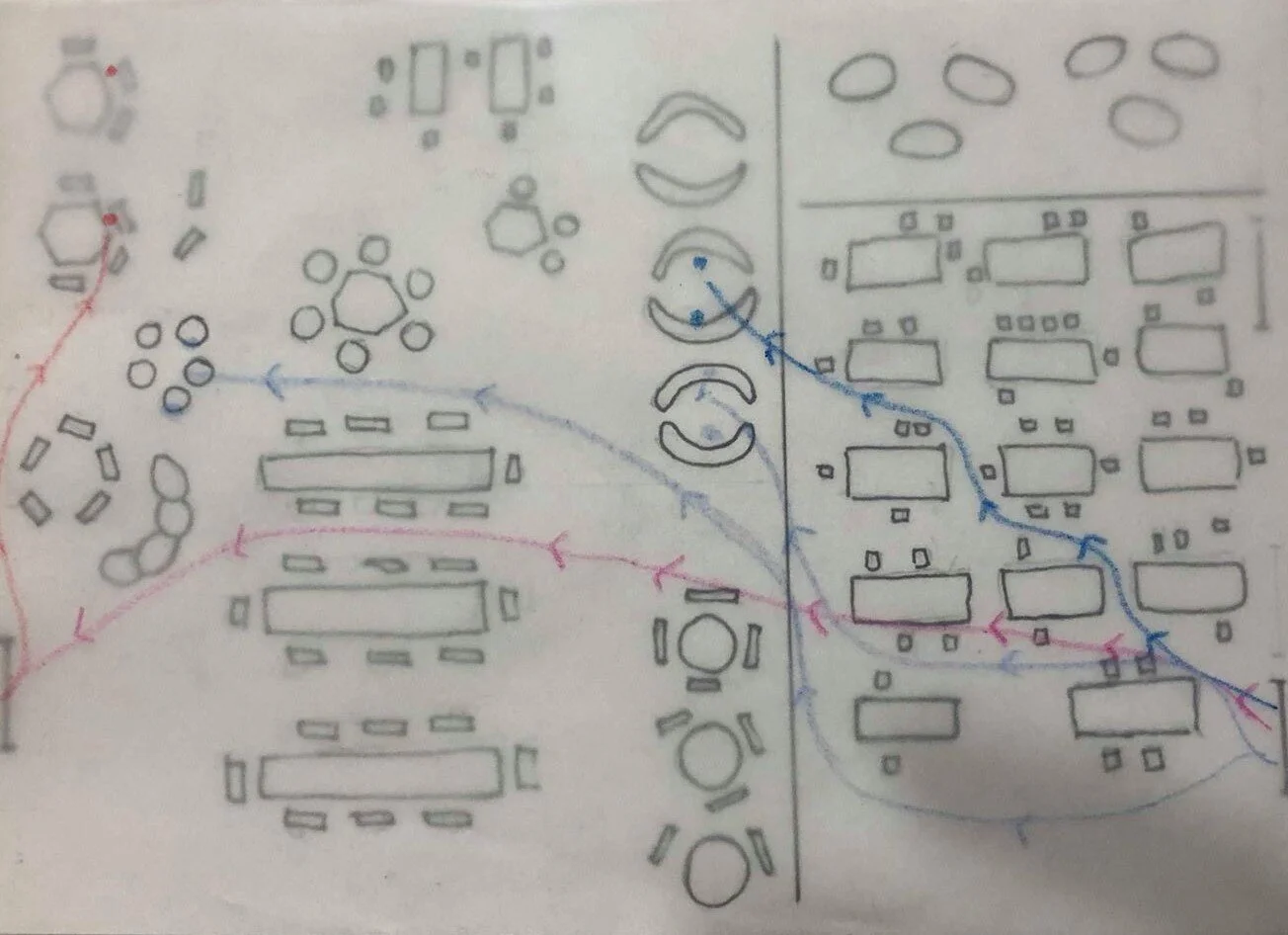 For contextual observation I mapped the human behaviour/ movement through space and time. This gave me a clear impression of how a space is used over time by multiple people and by individual users to see their how they interact with other people in the space.