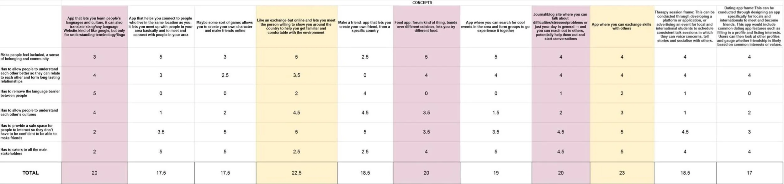 From this we chose the 3 highest solutions, from the pink ones we just chose the one we like the best and then we iterated on that by asking for feedback and once our concepts were solid we created 3 different user journey maps.