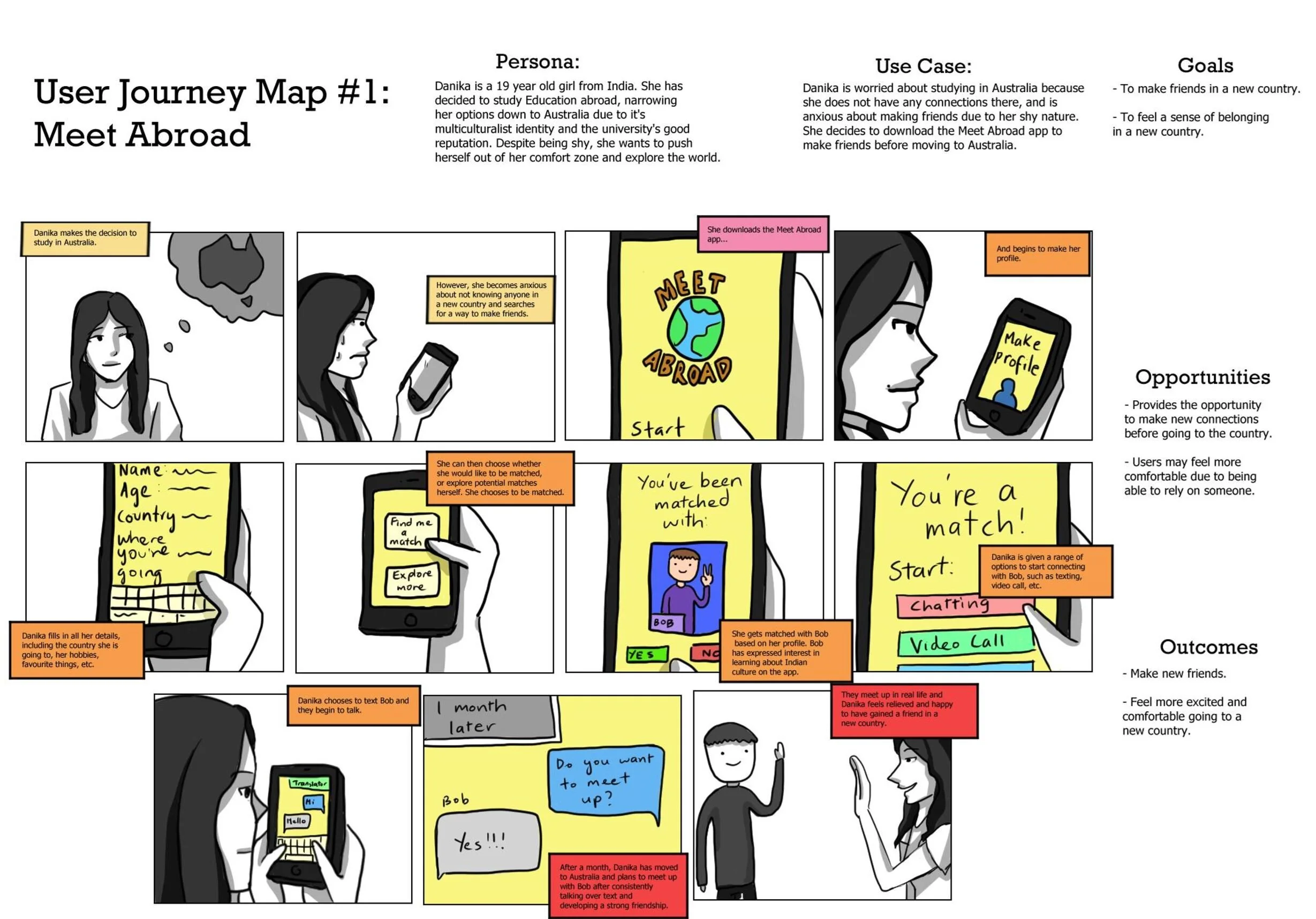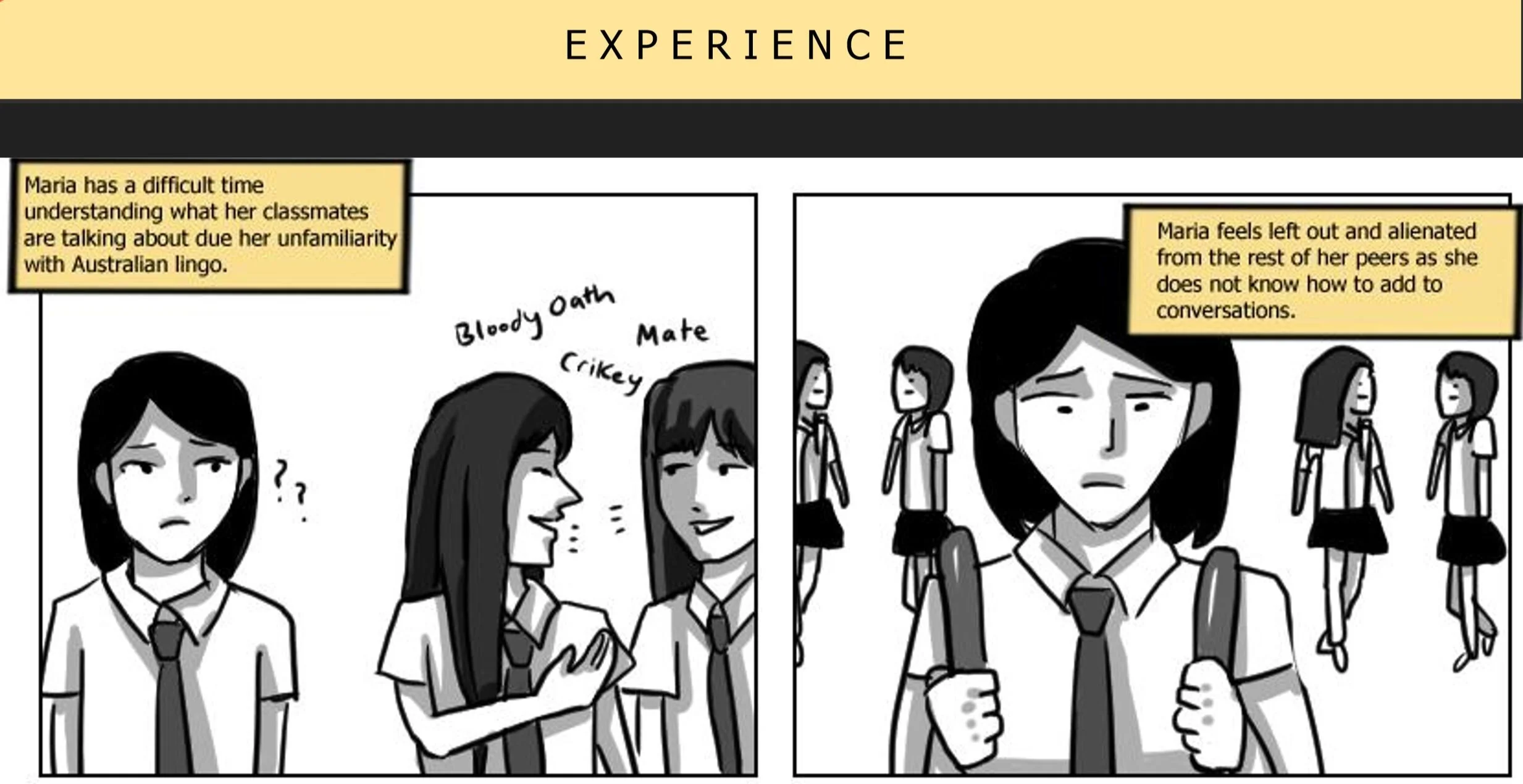 When storyboarding, the three main experiences that are currently being portrayed in the personas were highlighted. The first one looks at David who has already integrated into the Australian Society and made a lot of local friends however as Australia got more multicultural he started to drift towards the people of his own nationality as he has more in common with them. The second storyboard talks about Stacy who has just recently moved to Australia, however her English isn't very good and so she struggles to connect and find a sense of belonging in this new country. The final storyboard talks about Noora who want to make more friends outside of her friend group which is primarily international people and people of the same nationality as hers, however it is the other people who seem uninterested in making friends.