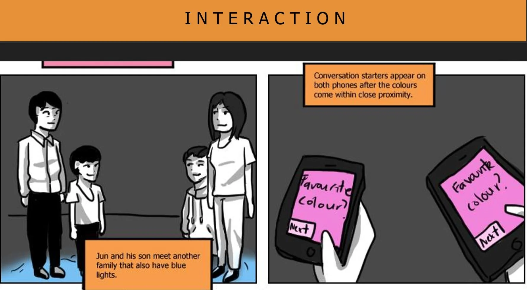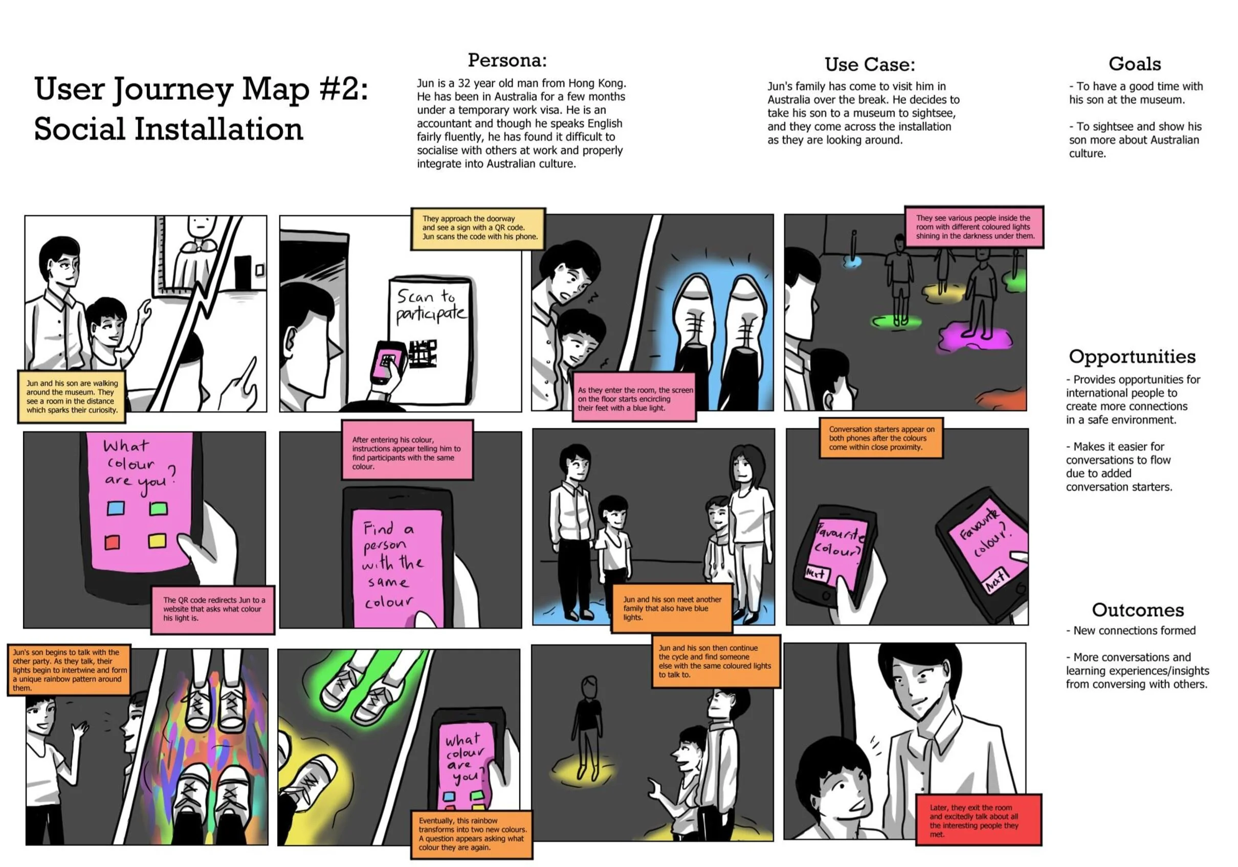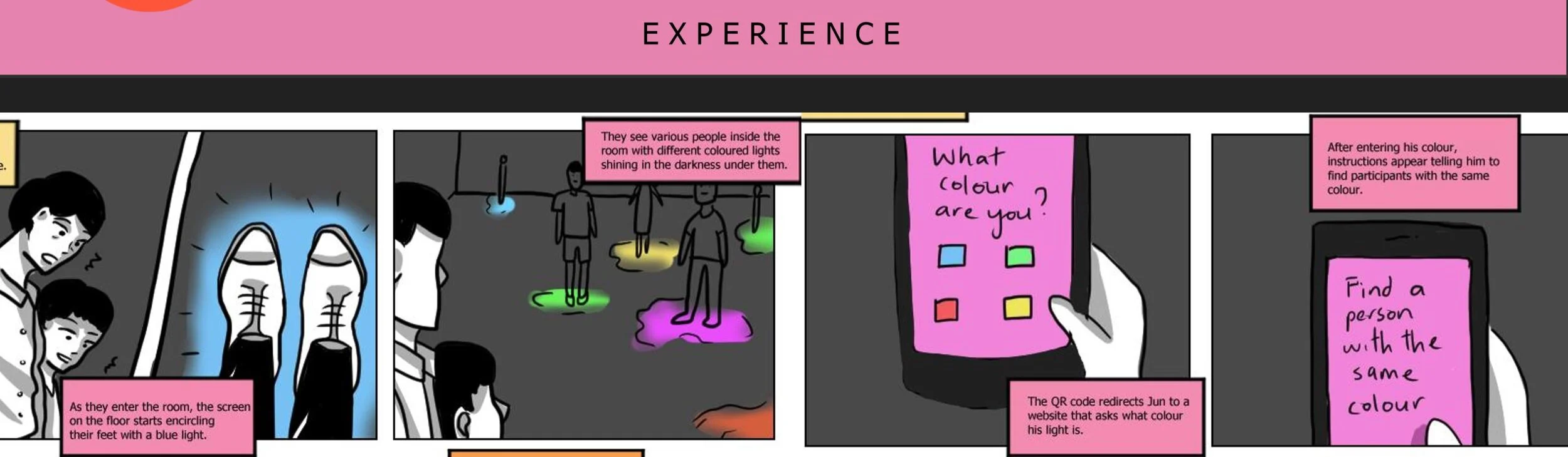It’s an installation within a huge room. So before stepping into the room, users scan the QR code with their phone, they then enter a dark room; however the floor is a screen with sensors that create a circle of light that follows you. The QR code then asks you what colour you are and tells you to find someone with the same colour, it then gives you a question that you need to answer and when you chat with them, your lights begin to expand and intertwine together to form a cool unique light artwork thing. The lights eventually transform into two different colours and you repeat the pattern again. Our installation gets rid of the communication barriers by providing conversation starters in a safe environment and helps to form potential substantial relationships when interacting with the installation