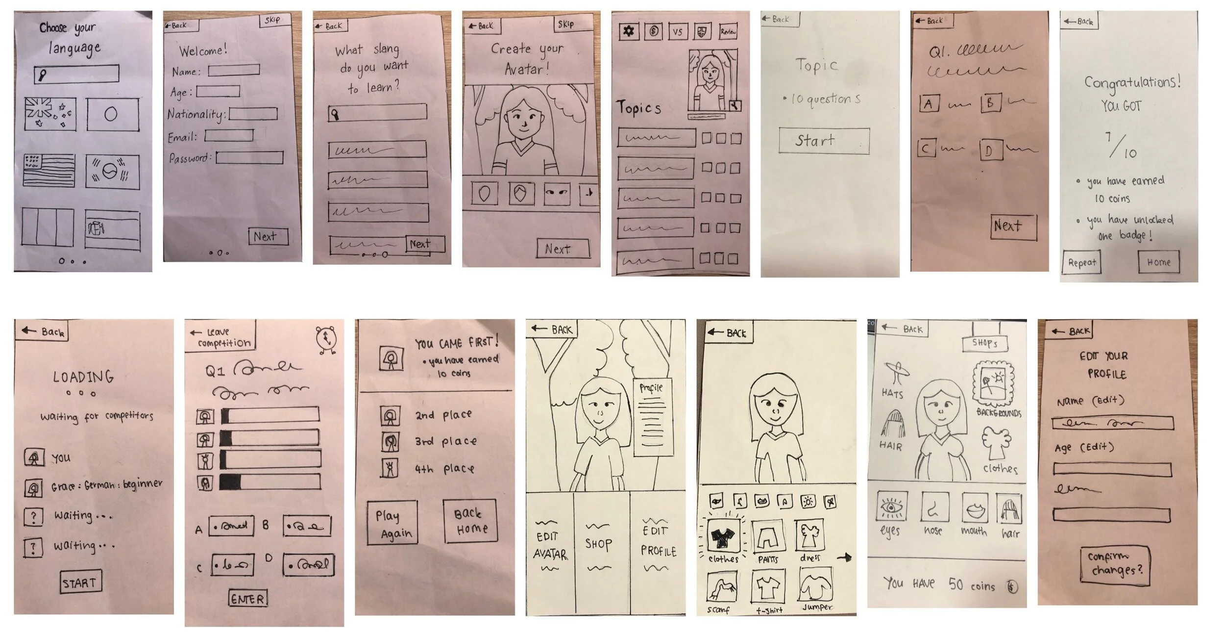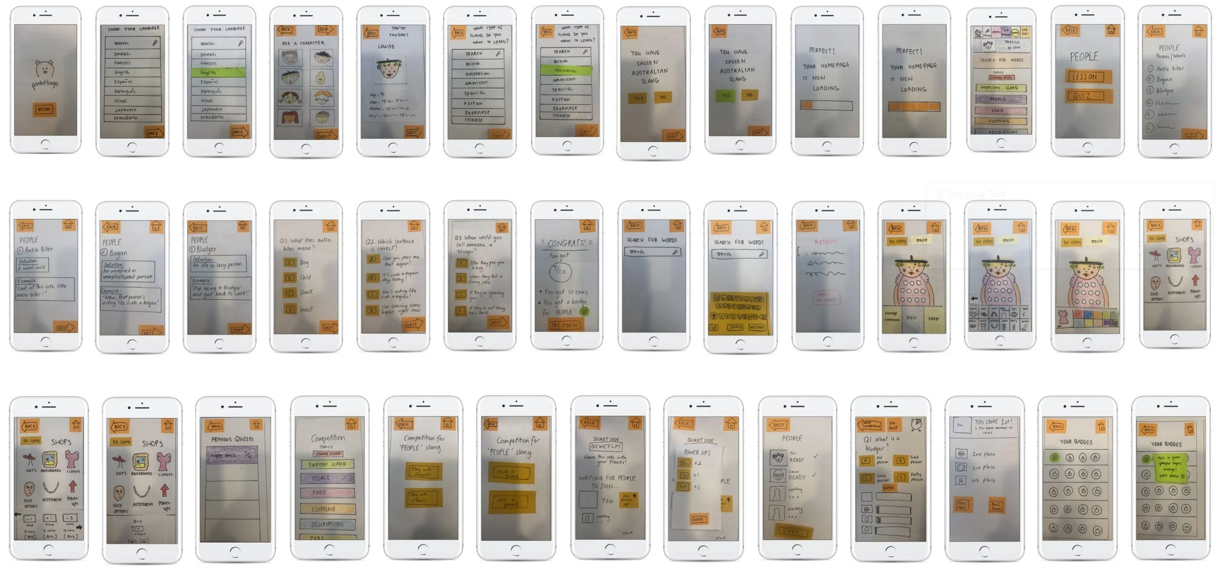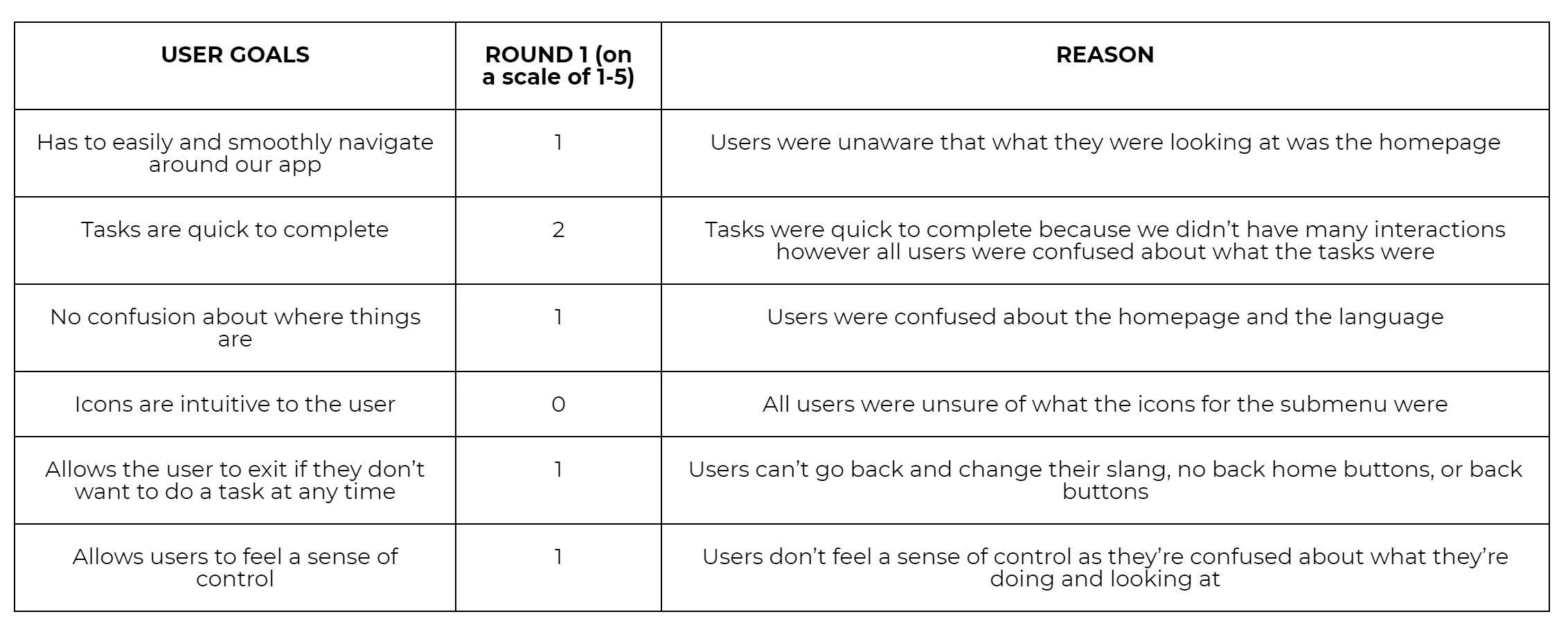 Thus, some suggestions that we thought of were adding a loading page before, or a nice ‘welcome to your homepage’ title to make the homepage more obvious, adding a back button or having a ‘change slang’ button on the homepage and writing titles under the icons.