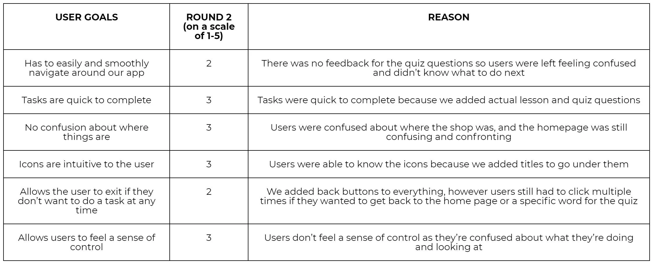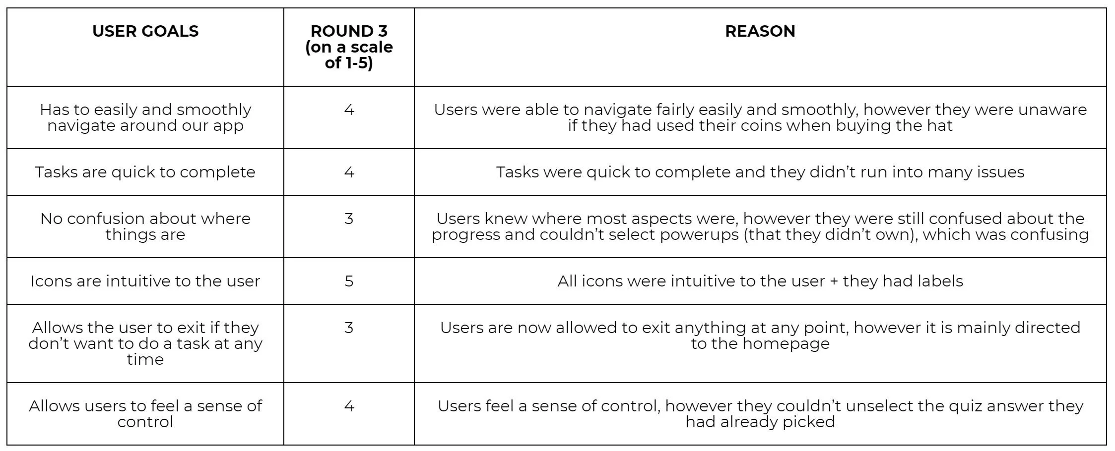 From the criteria for success, we can see that we needed to add feedback for the quiz questions, make the shop more accessible, and add more home buttons.